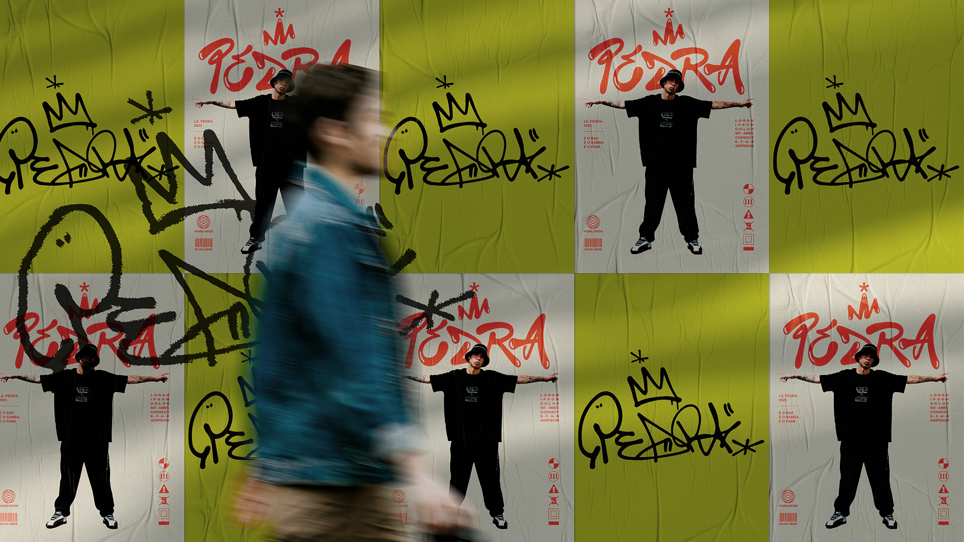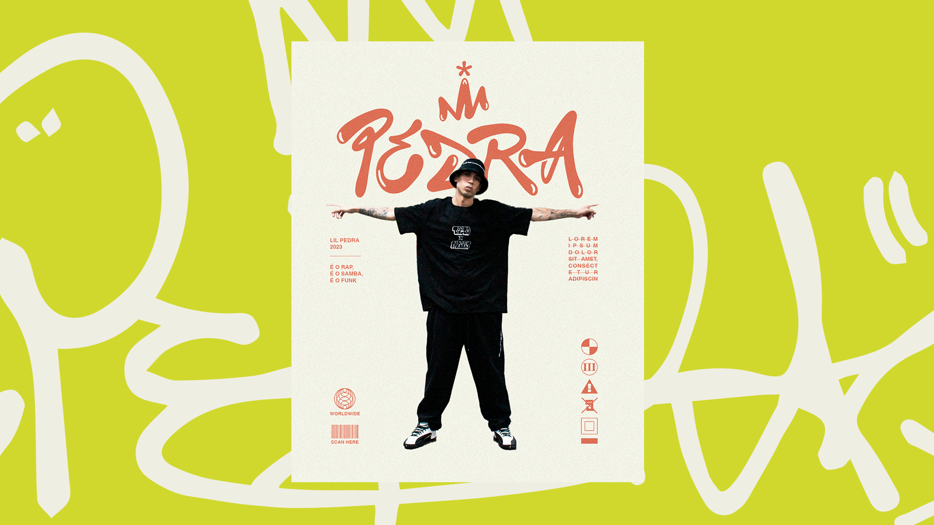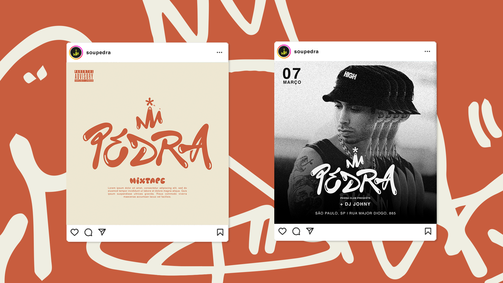 Com inspiração nos grafites da cena Hip Hop dos anos 90 e um toque de modernidade, a identidade nova que criamos é um reflexo da música de Pedra - que se apresenta misturando músicas atuais com clássicos, utilizando toca-discos.